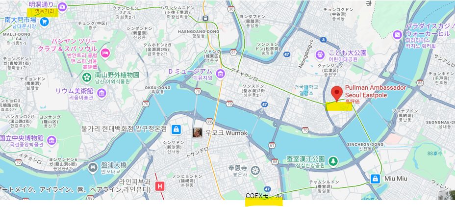 ご覧の様に、江南のCOEXモール(スターフィールド図書館や7LuckCasinoが入ってます)には地下鉄ですぐ行けますし、明洞へも比較的行きやすい立地なのはお判り頂けると思います。